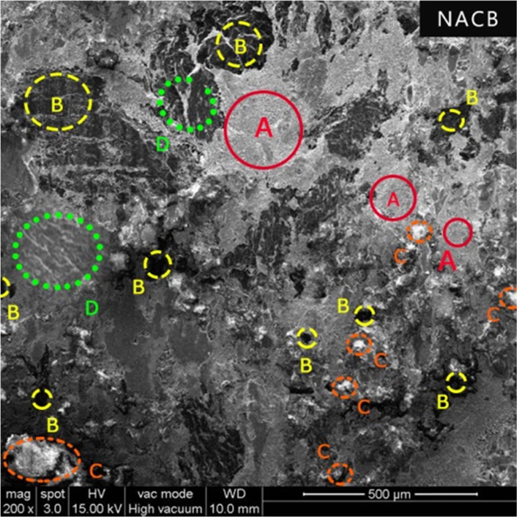 Fig. 5 Surface morphology of NACB brake pad (A - Primary Plateaus, B - Secondary Plateaus, C – Pits and D – Cracks). |