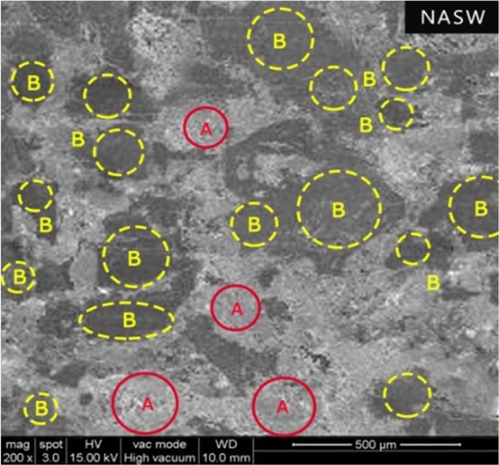 Fig. 6 Surface morphology of NASW brake pad (A - Primary Plateaus, B - Secondary Plateaus). |