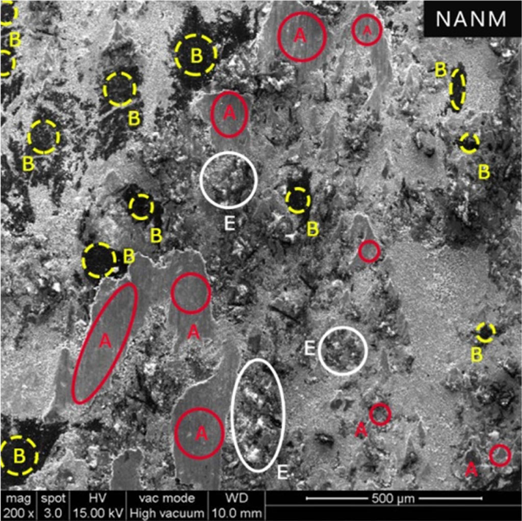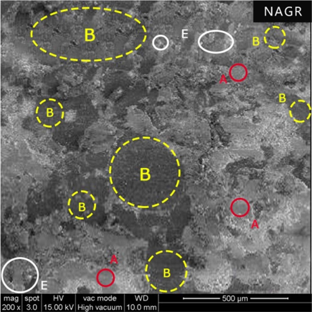 Fig. 9 Worn surface of the NAGR (A - Primary Plateaus, B - Secondary Plateaus and E – Worn out Particles). |