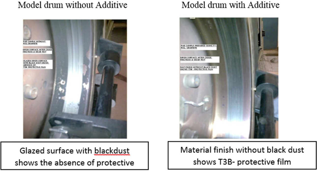 Unlike normal sulfide mix, PG-902 forms a continuous film or layer on the rotor surface during wear out by releasing alternatively positive and negative charges. The continuous film protects the braking path from damage and maintains consistent friction by acting as a physical separation between the opposing surfaces [32].