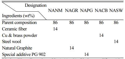 The friction composite fabrication was based on keeping parent composition of 86 wt% constant and varying ceramic fibers, Cu & brass powders, Steel wool, Natural graphite with commercial metal sulfides and PG 902, a specialty additive in each composition. The detailed ingredients in the formulation are shown in Table 1. Percentage weight of ingredients was adjusted not to change% volume in each composition to maintain porosity level between 6 and 8.