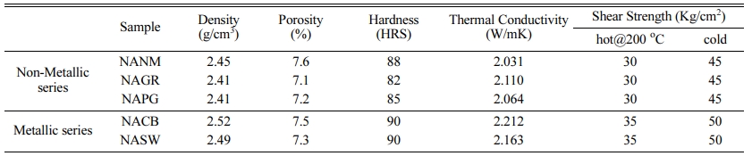 Table 2 lists out various physical and mechanical properties of the developed brake pads as there is always a close relationship between the physical pro- perties and the frictional behavior. From the tabulated results, density and hardness values are slightly higher for the metallic series (NACB & NASW) brake pads than the non-metallic series. This is expected due to the higher density of the metallic elements than the organic/inorganic counterparts. A direct relationship between hardness and wear resistance was reported by many researchers [13, 14], which are still under profound debate. As seen in the wear section, brake pads with higher hardness didn’t show wear resistance. Strong adhesion between metal fibers with the resin matrix improved the shear strength (both hot and cold) [15]. Metallic series-based brake pads possessed greater thermal conductivity due to metal greater thermal conductivity than the non-metallic series. For brake pads with poor thermal conductivity, frictional heat will be accumulated inside, causing degradation of resin and accelerating wear which can be observed in the wear results.