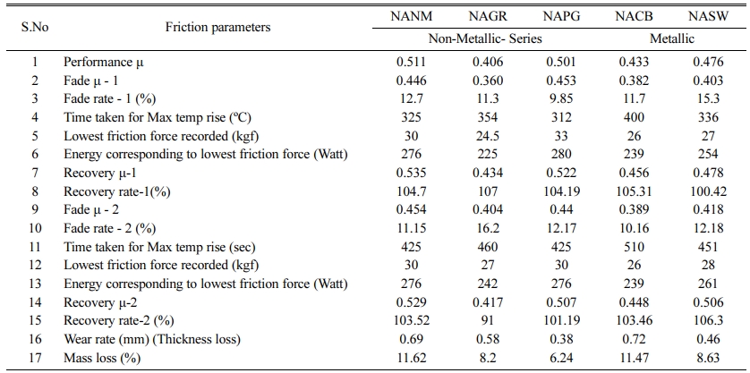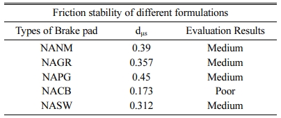 The friction stability of various formulations (Table 4) show that the friction stability of NACB belongs to poor. At the same time, all other brake pads come under the medium category. Here again, NAPG is the best among its competitors. This agrees with the discussion on the friction section.
