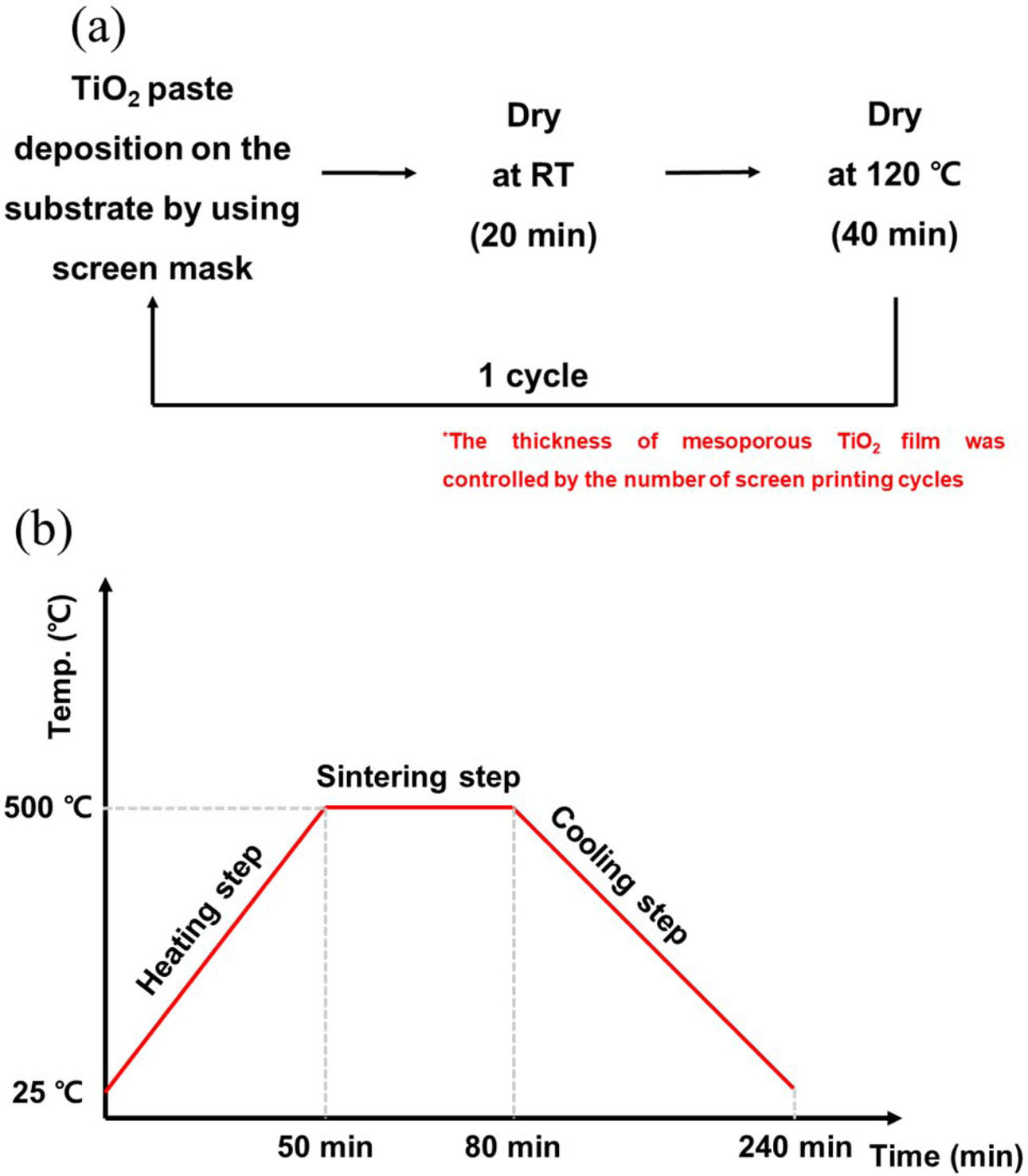 Fig. 1 (a) Schematic of the TiO2 film deposition cycles for screen printing and (b) the chamber temperature profile corresponding to time |