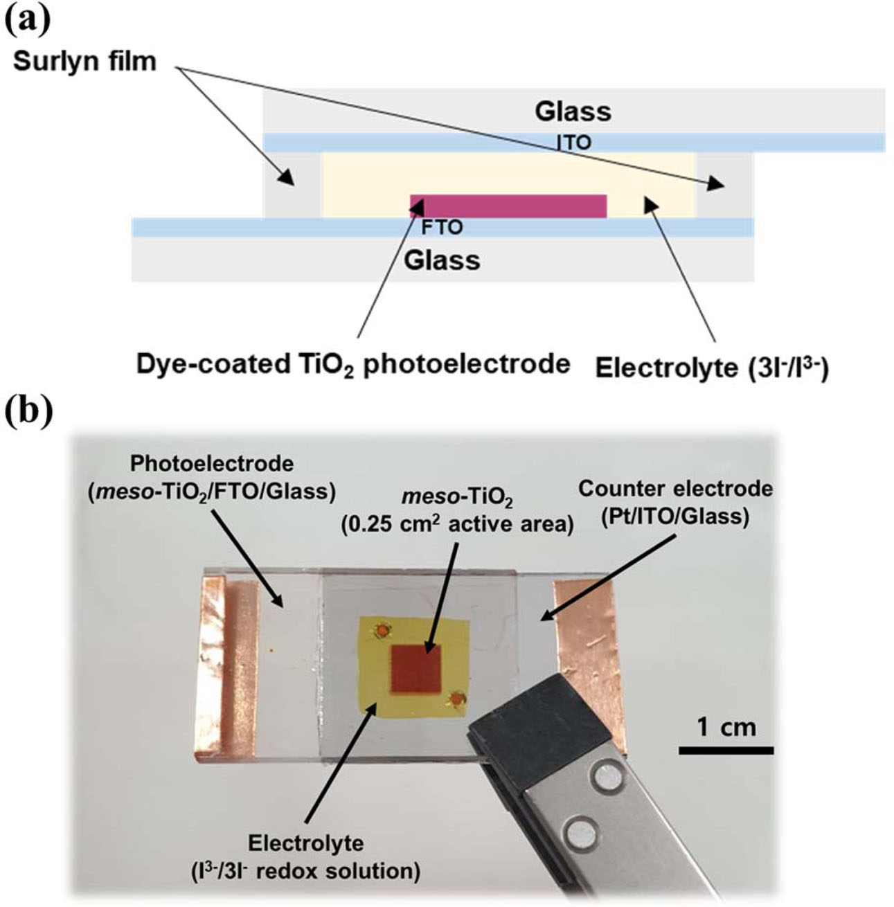 Fig. 2 (a) Schematic diagram of the structure of dye-sensitized solar cells and (b) photograph of the DSSC. |