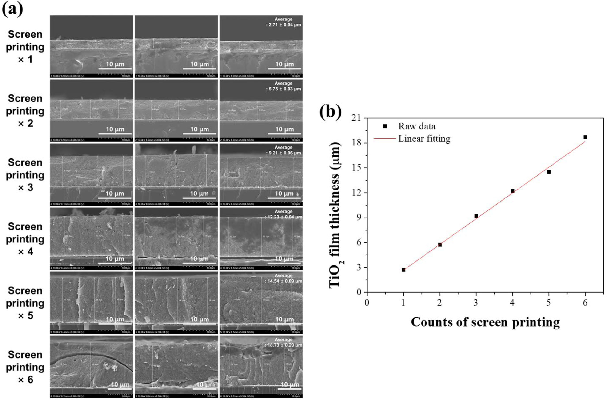Fig. 3 (a) HR-SEM images and (b) thickness change of the TiO2 film deposited by 1–6 cycles of screen printing. |