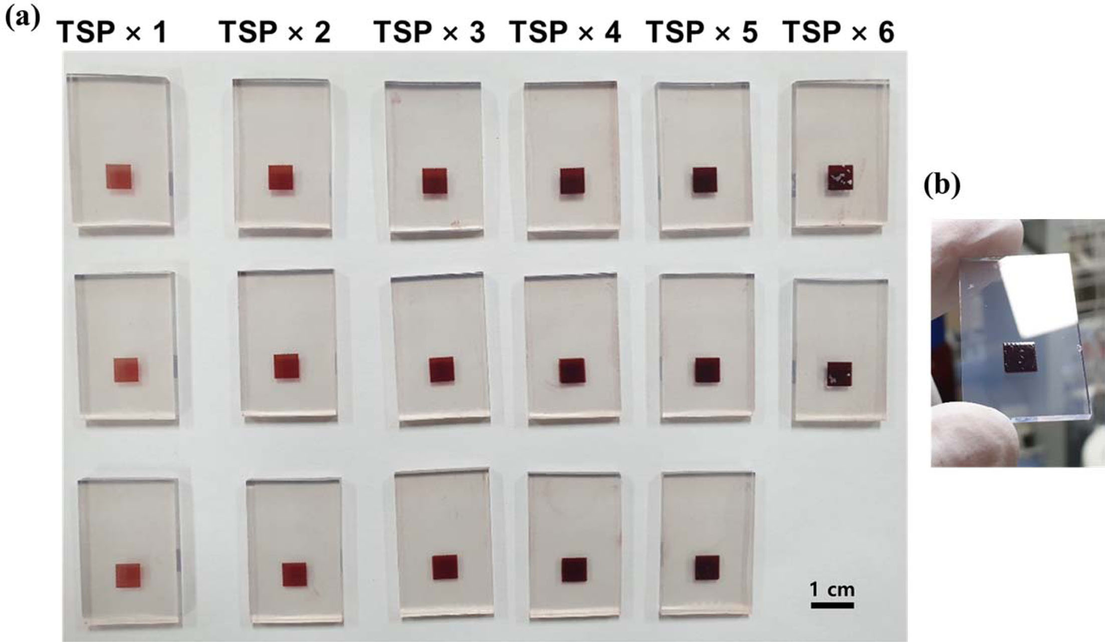 Fig. 4 Images of the (a) TiO2 film color change according to cycles of screen printing after dye loading process and (b) TSP×5 film to show a crack on the TiO2 surface. |