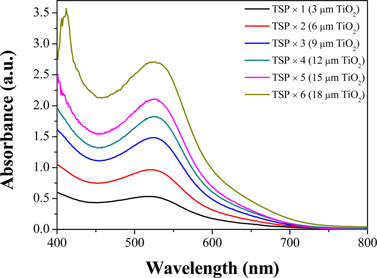 UV-visible spectroscopy analysis was performed to confirm the change in the adsorption amount of the N719 dye according to the change in the thickness of the TiO2 photoelectrode (Fig. 5). Similar to the color change tendency in Fig. 4, the absorbance in the 525-535 nm wavelength range had a tendency to increase as the thickness of the TiO2 photoelectrode increased [23, 24]. Therefore, the amount of dye adsorption increased by increasing the TiO2 mesoporous film thickness.