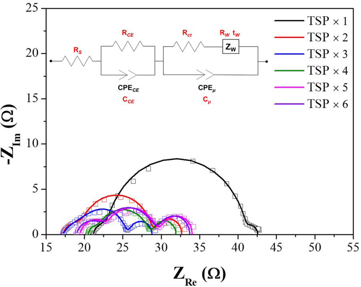 The thickness of the TiO2 films were analyzed by a high-resolution scanning electron microscope (HR-SEM, SU8230, Hitachi, Japan). Current-voltage (I–V) characteristics of the DSSCs were obtained under a standard illumination condition (100 mW/cm2 AM 1.5G) using source meter (Keithely 2400, Tektronix, Inc. USA) in the range of ±1 V, at a scan step of 0.02 V and during a delay time of 0.50 s. Electrochemical impedance spectroscopy (EIS) analysis was evaluated with a frequency range of 9 mHz to 100 kHz in a similar standard illumination condition using a potentiostat (SP150, Biologic SAS, France) to confirm the change in the electrochemical component in the DSSCs. The results of the I–V curve and EIS were analyzed with the averages values of at least six individual cells. Electrochemical parameters were obtained from the equivalent circuit and AC impedance spectra using the Zsim mode in the EC-Lab® analysis software.