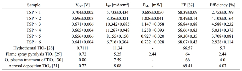 I–V characteristic measurements were performed to confirm the performance according to the change in the thickness of mesoporous TiO2 films and the parameters are listed in Table 1. As shown in Fig. 6, the efficiency increases as the thickness increases for up to 4 screen printing cycles. Noticeably, the current density increases with increasing thickness corresponding to the tendency of efficiency. The increase in the concentration of electron generation is because of the increase in the adsorption amount of the dye as the TiO2 thickness increases, resulting in an increase in Fermi level in the TiO2 conduction band, following an increase in current density with up to four screen printing cycles (12-μm thick). However, after four cycles printing, the perfor- mance of DSSC tended to decrease. According to the previous studies, the DSSC performance decreased when the photoelectrode had a critical thickness because of the reduced light transmittance and increased recom- bination, leading to a reduction in the electron generation and current density [25,26]. However, in this study, surface cracks were observed in the samples with a thickness of 15 μm (five screen printing cycles) and 18 μm (6 screen printing cycles), as shown in Fig. 3 and Fig. 4(b). The decrease in current density and performance after the fourth screen printing cycle is attributed to the surface crack generated when the deposition is too thick. The VOC has a tendency to decrease gradually as the thickness increased because the TiO2 photoelectrode creates a surface trap level on the TiO2 surface, resulting in an increase in the recombination with the electrolyte and consequent reduction in the VOC [22, 27]. Moreover, our results demonstrate that the obtained performances are comparable with several literatures [28-31] (Table 1).