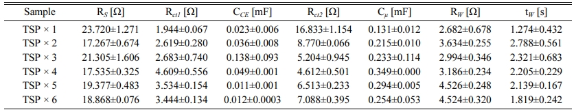 Table 2 Electrochemical resistance and capacitance of illuminated DSSCs of the TiO2 photoelectrode according to TiO2 film thickness change under open circuit conditions. Data were obtained from EIS fits using the equivalent circuits in Fig. 7. |