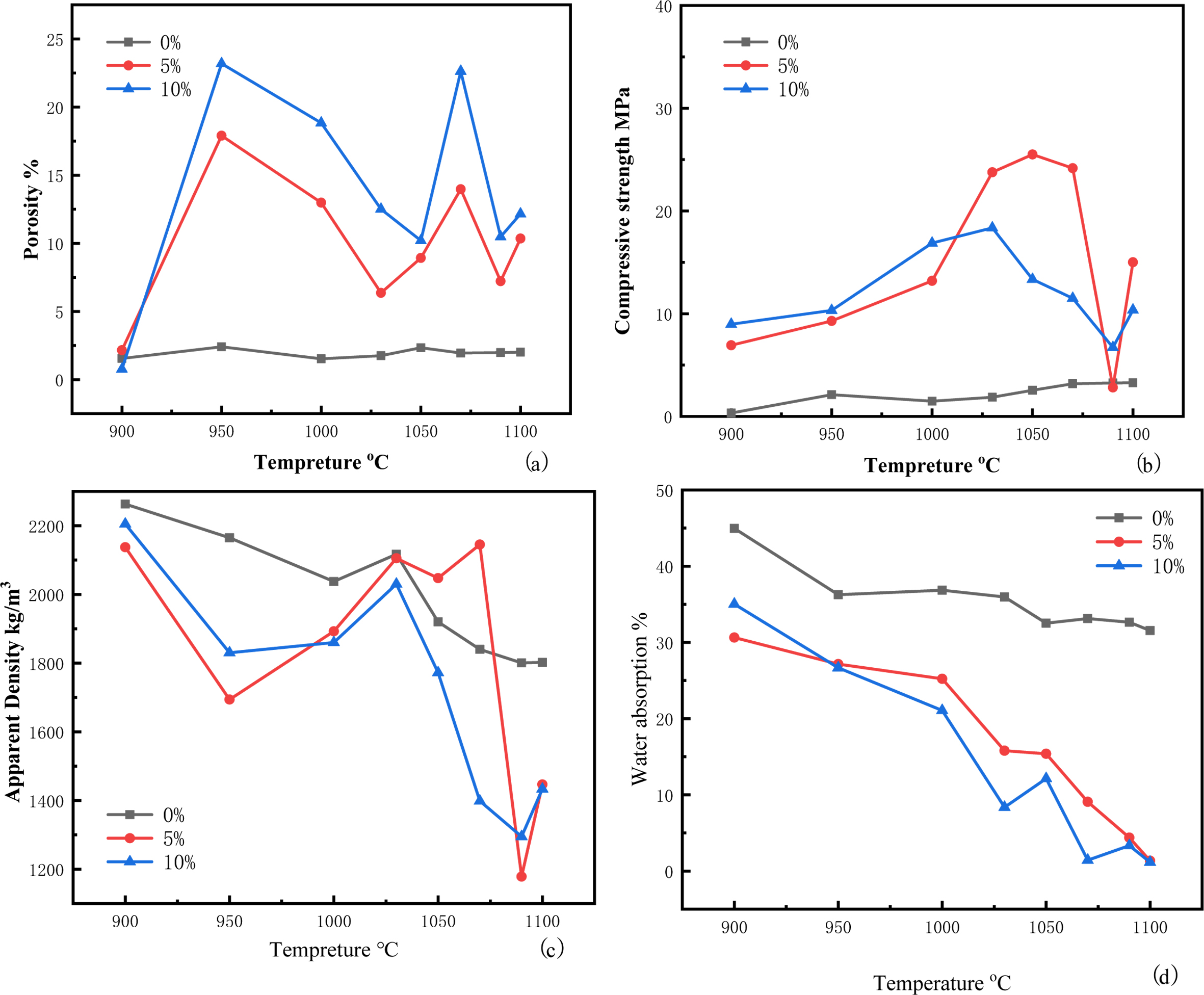The porosities, compressive strengths, apparent densities, and water absorptions of the ceramsite with different Na2CO3 contents are presented in Fig. 1.