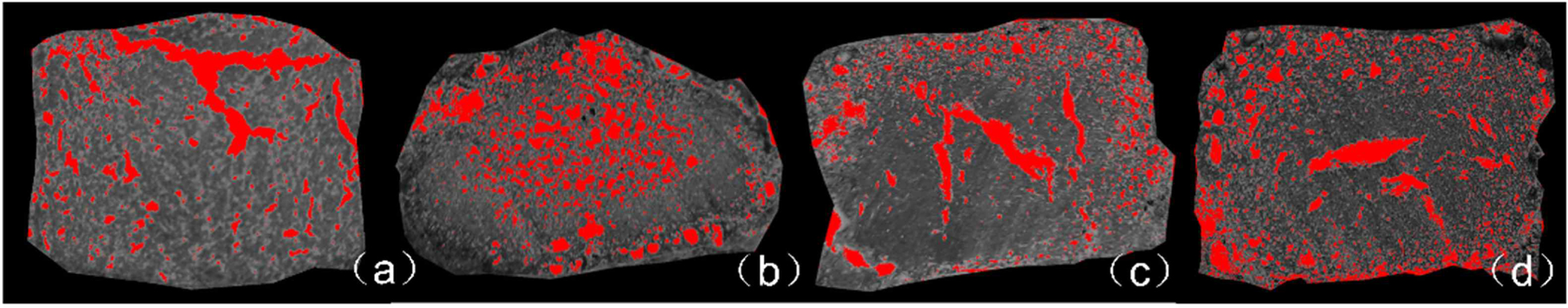 Fig. 2 ImageJ analyses of the 10% Na2CO3 ceramsite cross-sections at different temperatures: (a) 950 oC, (b) 1070 oC, (c) 1090 oC, (d) 1100 oC. |