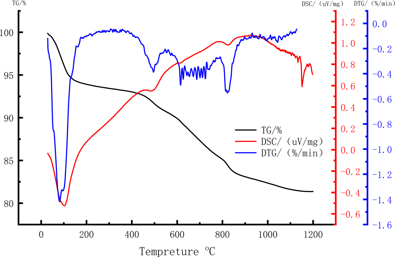 The porosity measurement method was adopted by imageJ grey analysis method. The specific method is as follows. The ceramsites was cut from the center, and the cross section of the ceramsite was polished and coated with thick aluminum powder. After flattening the powder with a knife, the surface was imaged with a digital camera and analyzed with ImageJ software to observe the internal pore morphology and calculate the porosity. The compressive strength of ceramsites was measured by the maximum pressure withstood by the ceramsites under the crushing strength machine (Instron Corporation 34SC-5, America). The density of the ceramsite was measured by the Archimedes method. The water absorption of ceramsite was recorded by the rate of weight change before and after the ceramsite was soaked for 30 min. The thermal behavior of the raw materials was studied by using a thermogravimetric analyzer (NETZSCH-Gerätebau GmbH DSC404F3, Germany). The test conditions were set as follows. In an air atmosphere, the sample was heated from room temperature at a rate of 10 oC/min, and the end tem- perature is 1200 oC. The properties of both raw materials and the sintered products were characterized by X-ray diffraction spectroscopy (XRD) (PANalytical B.V. X Pertpro, Netherlands) and scanning electron microscopy (SEM) (Carl Zeiss AG ULTRA PLUS, Germany).