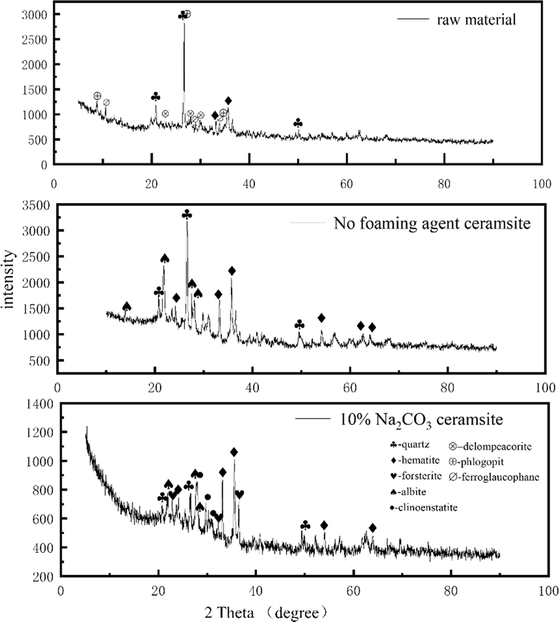 3. Through the phase analysis of the high-strength lightweight ceramsite prepared with Na2CO3 as the foaming agent, it was found that the quartz, phlogopite, hematite, amphibole and enstatite in the raw meal were converted into albite and magnesium Olivine and clinostatite form a structure with forsterite as filling and albite as skeleton, which could promote the firing of ceramsite with high strength and low density.