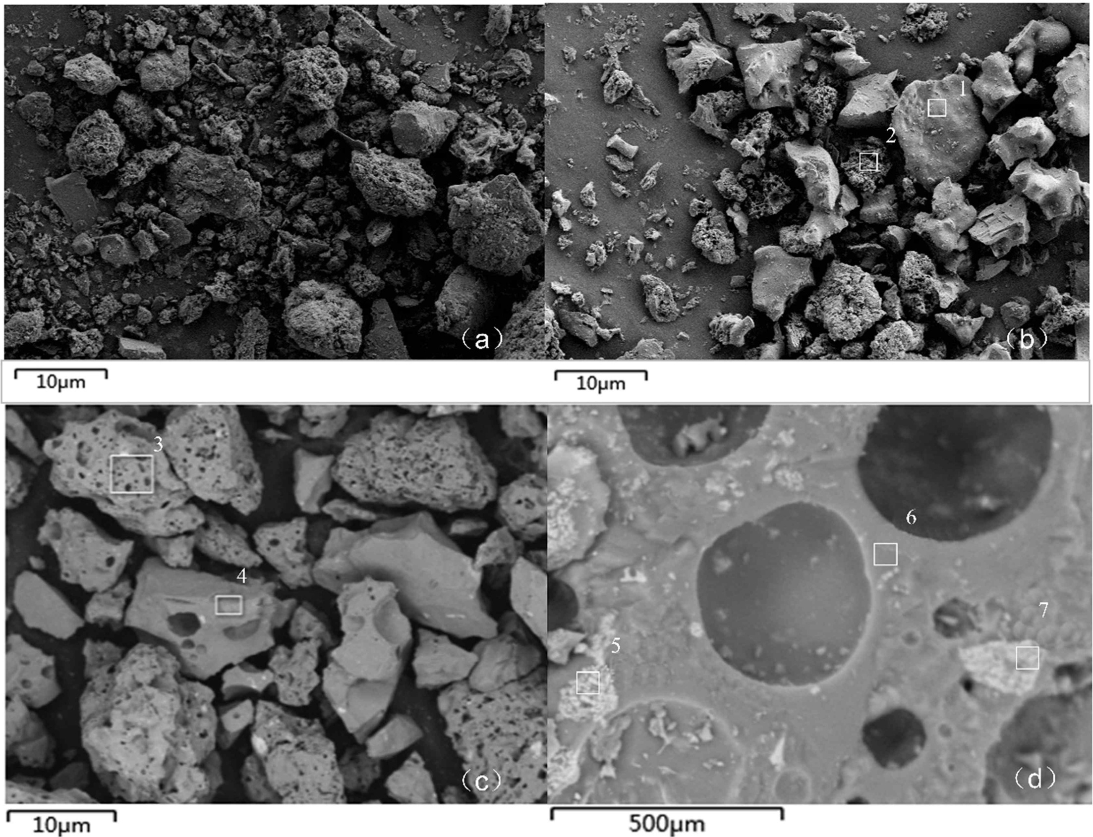 The SEM image of raw meal shows a loose structure with a rough surface and a relatively uniform distribution of minerals (Fig. 6(a)). The sample fired without the foaming agent exhibited both dense (Fig. 6(b)-1) and loose (Fig. 6(b)-2) areas. After scanning these areas with energy-dispersive X-ray spectroscopy (SEM-EDX), the proportions of atoms differed from those of the raw material. The dense areas contained increased quantities of Al and Si, and a small amount of Na, suggesting a mineral phase change to albite (Na2OAl2O36SiO2). In the loose areas, the Mg content was increased but had not reached the required temperature for the formation of mafic or forsterite minerals [31]. Therefore, no sup- porting minerals that would improve the compressive strength had formed at this time. Moreover, the new mineral albite could melt within the mineral gaps. On the ceramsite surface, which is more susceptible to heat than its interior, the openings were easily filled by albite, and the glaze became more complete, filling most of the surface holes. Comparing these results with that of the control, we inferred that the foaming agent was closely related to glaze formation, and hence to the decreased water absorption of ceramsite. The gas produced by the organic matter in 0% Na2CO3 ceramsite could not form pores at the existing ratio of raw materials. After adding the foaming agent (Fig. 6(c)), porous (Fig. 6(c)-3) and dense (Fig. 6(c)-4) areas appeared, and the pores were uniformly distributed in the porous area. SEM–EDX (Fig. 6(c)-3) revealed a predominance of Mg and Na in the porous and dense areas, respectively, indicating that the tight and porous areas were partially fused with each other. A high-magnification image of the porous area (Fig. 6(d)) revealed other minerals scattered on a frame-like struc- ture interspersed with holes. Forsterite (Fig. 6(d)-5) and hematite (Fig. 6(d)-6) were identified as the main minerals, while the main structure was dominated by albite (Fig. 6(d)-7). The forsterite was distributed on the pore-filled ceramsite, and hematites with higher hardness were embedded in the albite framework, increasing the pressure resistance of ceramstite.