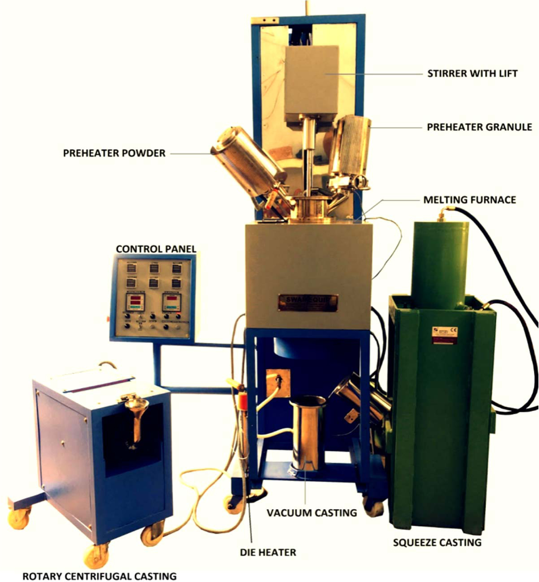 The combined squeeze and bottom tapping way is the most potent method to manufacture good quality ZE41A/Si3N4/Al2O3 homogenously dispersed Mg co- mposites using stir casting method. The casts were conducted using a Semi automatically operated Stir casting furnace coupled with squeeze setup developed indigenously at Swam Equip, Chennai. The setup and its associated components can be seen in Fig. 1. Mg ZE41A ingots are loaded into the preheated furnace (at 750 ºC) as chopped metal pieces (resembling biscuits) form then reinforcement particles are addedthrough powder pre-heateras first layer, then base material and reinforcement are added layer by layer successively twice. The stir casting furnace is heated to reach the temperature of above 650 ºC which is the melting point of Mg, the reinforcement materials are added along with the magnesium matrix material. The stirring motion of mechanical stirrer the experimental setup is controlled by a stepper motor. When the motor is engaged the melted matrix and reinforcements are stirred at a speed of 500 rpm for duration of 2 min in a scattered manner [18].