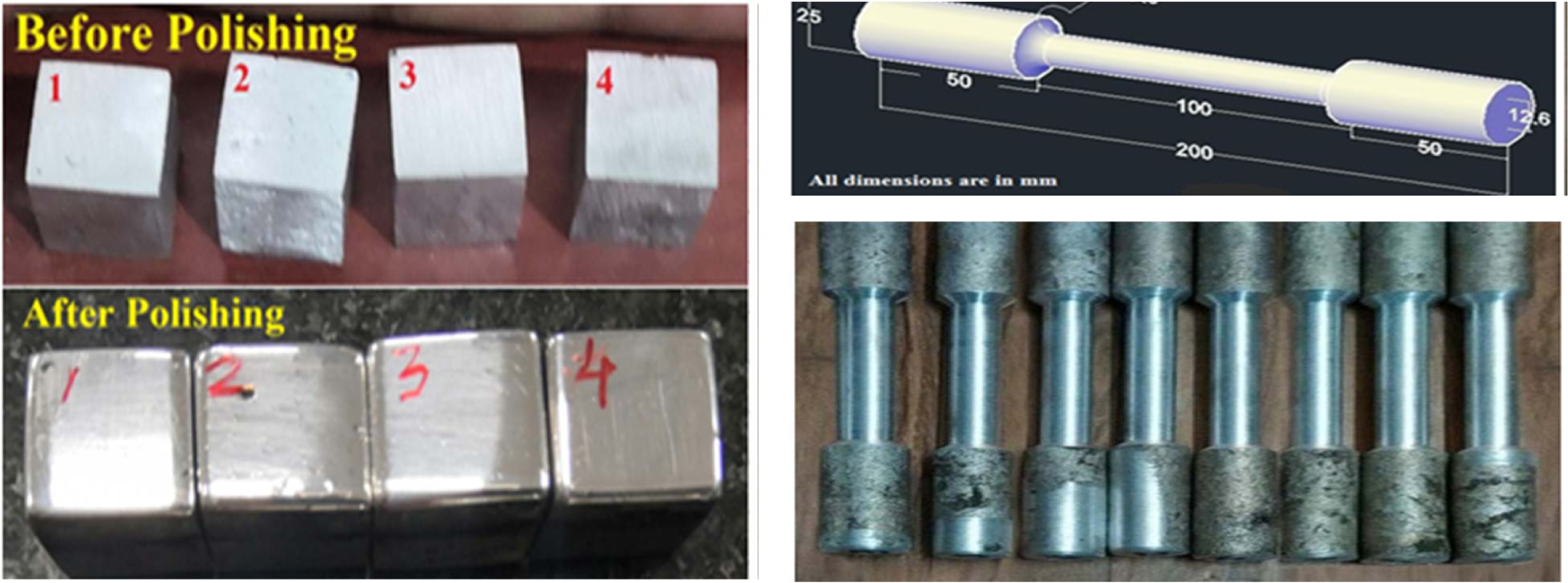 The produced composites were cylindrical in geo- metry with dimensions of 25 mm diameter and 300 mm length. The Mg matrix composite material is quickly air quenched so that it reduces the setting of reinfor- cement particulates in liquid matrix materials. Fabricated composite casts were severed per standard procedure to create Tensile, OM, SEM and EDS analysis samples. For tensile tests, cylindrical samples were readied as per ASTM E8/E8M standards and procedures as can be inferred from Fig. 2(b) below. For tensile tests two specimens were acquired from each fabricated com- posite. Fig. 2(a) shows the before and after polishing scanning electron microscopy (SEM) specimens and Fig. 2(b) shows the ASTM E-8 standard Mg matrix MMC specimens.