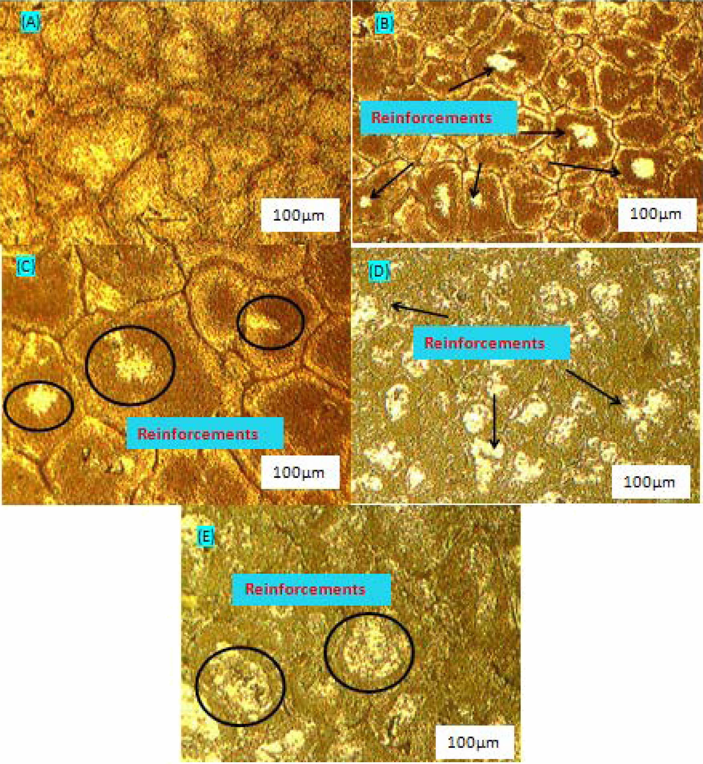 Fig. 3 OM Analysis of Mg Hybrid MMC: (a) Pure Mg (ZE41A), (b) 1 wt% of Si3N4 and 1 wt% of Al2O3, (c) 2 wt% of Si3N4 and 2 wt% of Al2O3, (d) 3 wt% of Si3N4 and 3 wt% of Al2O3 and (e) 4 wt% of Si3N4 and 4 wt% of Al2O3. |