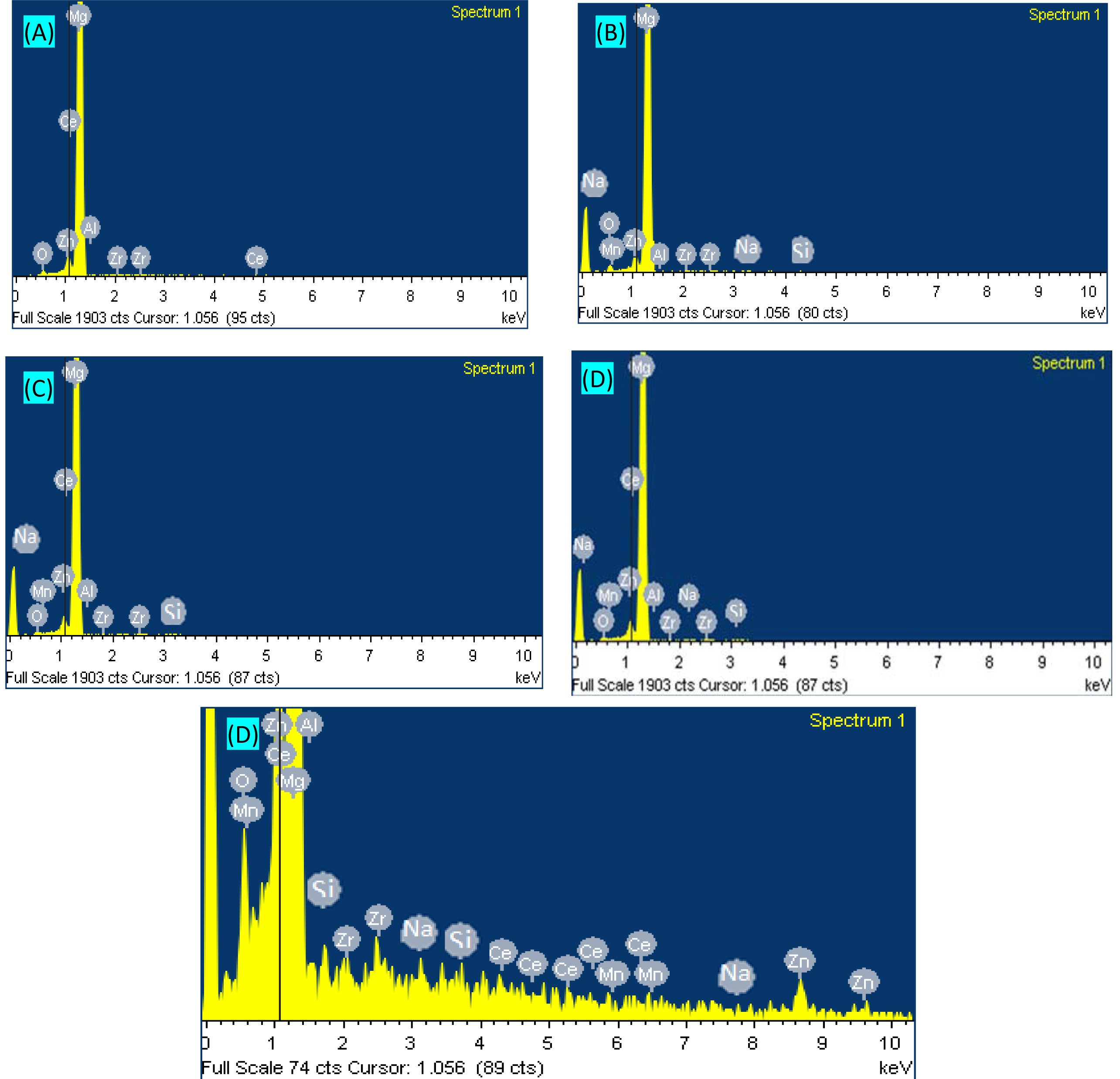 The EDX spectrum graphs shown in Fig. 5 correspond to the prepared pure ZE41A and ZE41A/ Si3N4/Al2O3 composites of all wt.% compositions. Presence of oxygen, aluminum, magnesium, manganese and zinc in K series is observed, where zirconium and cerium in L series could also be seen. Due to excessive correction factors for atomic number and absorption, we were unable to detect all together the presence of some elements. But samples with 1 wt% of Si3N4 & 1 wt% of Al2O3; 2 wt% of Si3N4 & 2 wt% of Al2O3; 3 wt% of Si3N4 & 3 wt% of Al2O3, it can be noted that the reinforcements are evenly distributed, as the result of secondary heating.