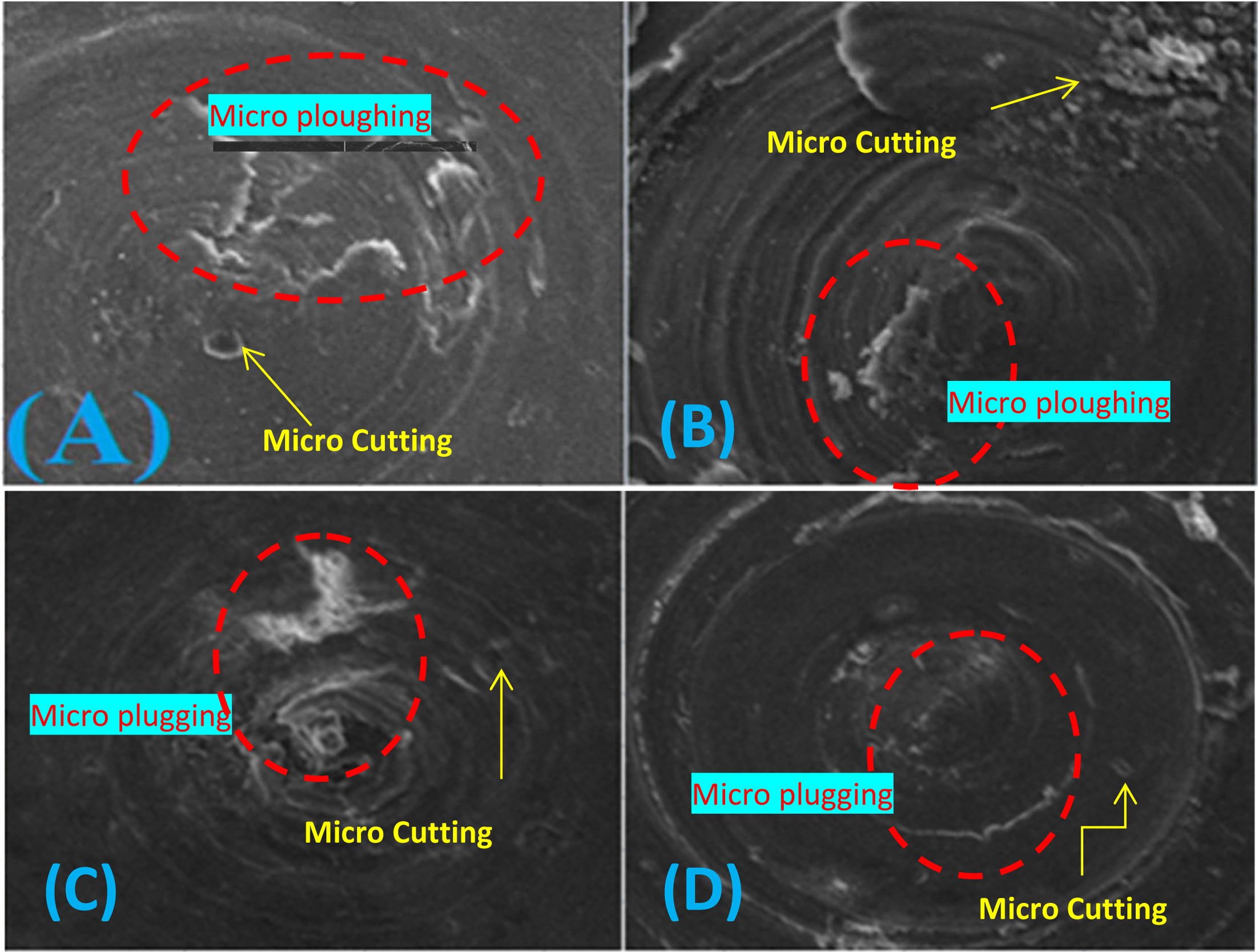 Worn surface analysis of each composite material samples was conducted after the wear analysis of the specimen. Fig. 10(a-d) shows the worn SEM analysis of Mg based MMC materials.It is obtained by changing the weight proportion of Si3N4 and Al2O3 in Mg ZE41A. Each HMMC samples exhibit two characters are having micro-cutting and micro-ploughing [22]. The maximum wear resistance for the HMMC was obtained when the composition of reinforcements was 4% Si3N4 and 4% Al2O3.