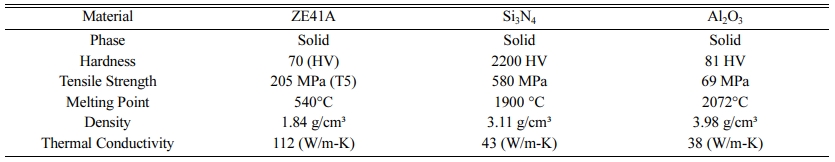 Aluminum Oxide or Alumina (Al2O3) is a common ceramic commercially available today, signifying its general-purpose role in today`s engineering landscape. It has excellent hardness and wear resistance values combined by high compressive strength at extreme operating temperatures. It also possesses the value of easy processing and cost benefits. Granular reinforcements also assist in enhancement of properties such as resistance to erosion, wear, superior damping coefficient and superior mechanical, thermal properties [14-16]. In a pursuit to characterize Magnesium composites, Shenet al. (2017) [17] reinforced Silicon Carbide on AZ31B, conducted tests based on casted and heat-treated con- dition of specimens, found that the lower tensile strength and ductility of the MMC materials when compared to the base Mg alloy. Thus, owing to the excellent mechanical and metallurgical property benefits offered by Alumina, it is chosen as the secondary reinforcement for this study with Mg ZE41A as the base metal and Si3N4. Table 2 shows the basic properties of the matrix materials can be inferred.