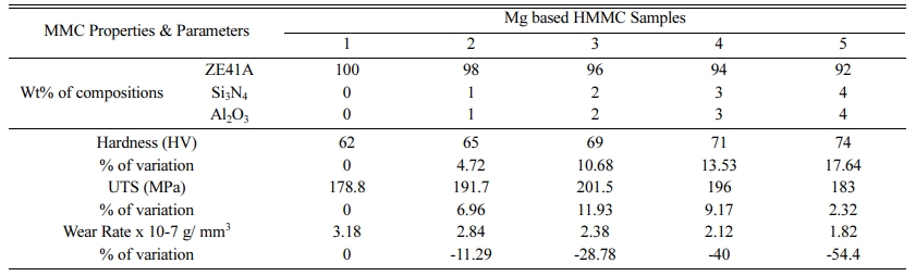 During tensile test experiment the internal stresswas developed between two reinforcement particulates (Si3N4 & Al2O3) and base Mg (ZE41A) metal. This interaction of matrix and reinforcement, the materials fail until change of small area when the localized stress found to be the higher than strain level. In present Mg matrix MMC’s the limited area damage could be in the forms of de-bonding and initiation of crack in both reinforcement particulates, matrix materials. As observed from Fig. 7 & 8, above 4.5 wt.% of reinforcement, with increase in reinforcement particles, the agglomerations increase. Thus, the imperfection induced around the reinforcement particles due to the difference in the thermal coefficients of ZE41A and Si3N4, Al2O3 might result in de-bonding of the interface and decrease in UTS in the composites. This phenomenon was also observed by Kumar et al. (2017) [22], with their work using AZ91E and Al2O3 nano particles. The peak UTS obtained is 201.5MPa with the HMMC combination of 96% Mg ZE41A + 2% Si3N4 + 2% Al2O3.