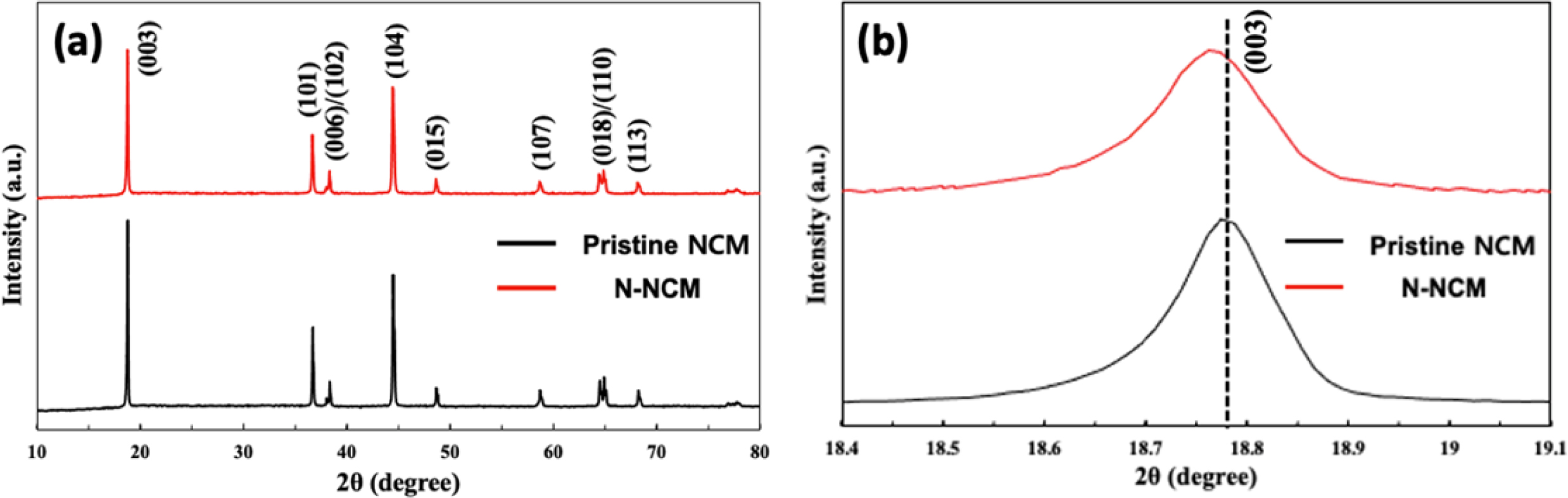 Fig. 1 (a) XRD pattern of pristine NCM and N-NCM, (b) (003) diffraction peak of samples. |