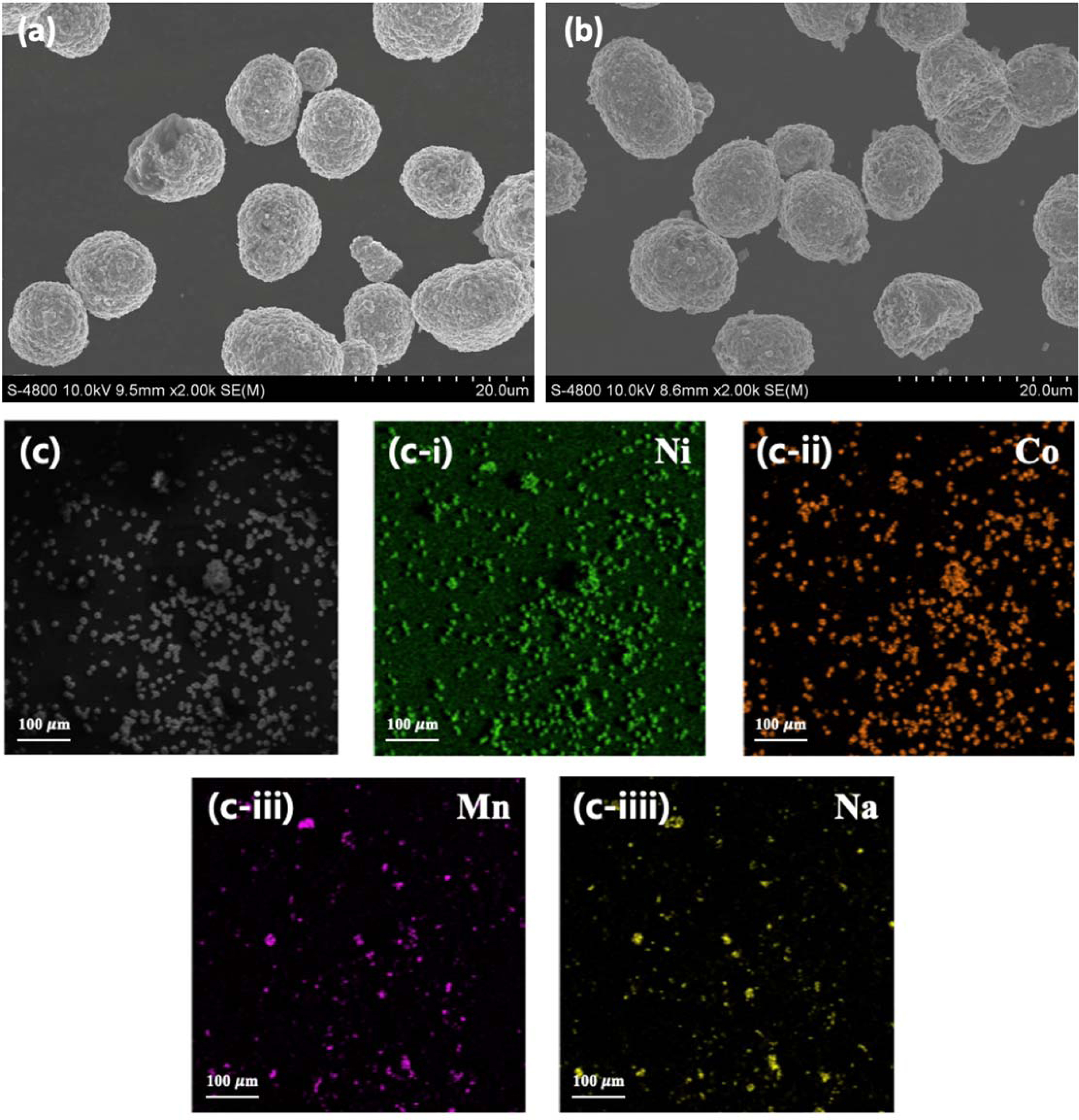 Fig. 2 exhibits FE-SEM images of pristine NCM and P-NCM samples. It can be observed that all cathode materials are composed of sphere-like morphology with an average primary particle size of approximately 9.7 μm. Moreover, the spherical secondary particles consist of primary particles of about 175 nm. Here, there are no big differences between the surface morphology of the pristine NCM (Fig. 2(a)) and N-NCM (Fig. 2(b)). This observation indicates that sodium doping does not change the sphere-like morphology as well as the particle size of NCM cathode materials. Fig. 2(c) shows EDS mapping images of N-NCM to observe the existence of Na atom. We can observe that Ni, Co, Mn and Na atoms are uniformly distributed in N-NCM sample.