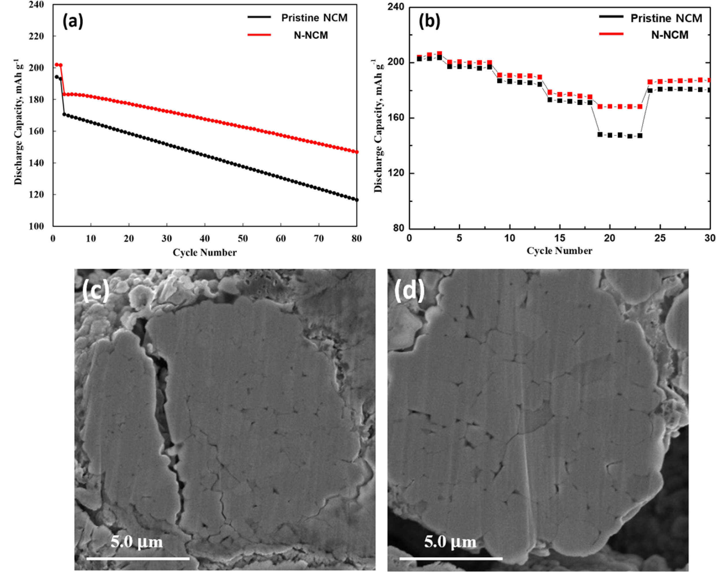 Fig. 3 (a) Cycle performances and (b) rate performance of pristine NCM and N-NCM. Cross-sectional FE-SEM images of (c) pristine NCM and (d) N-NCM. |