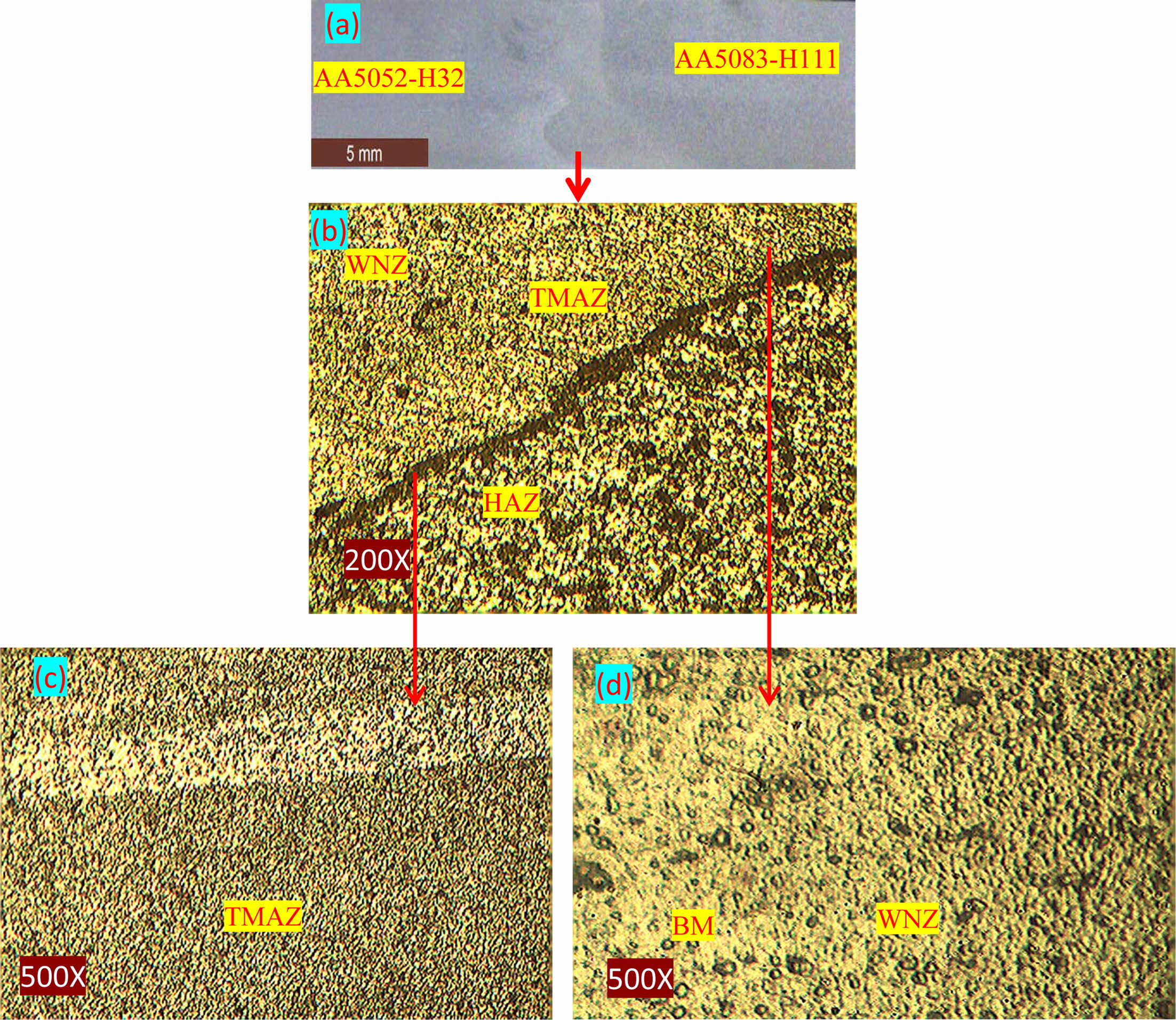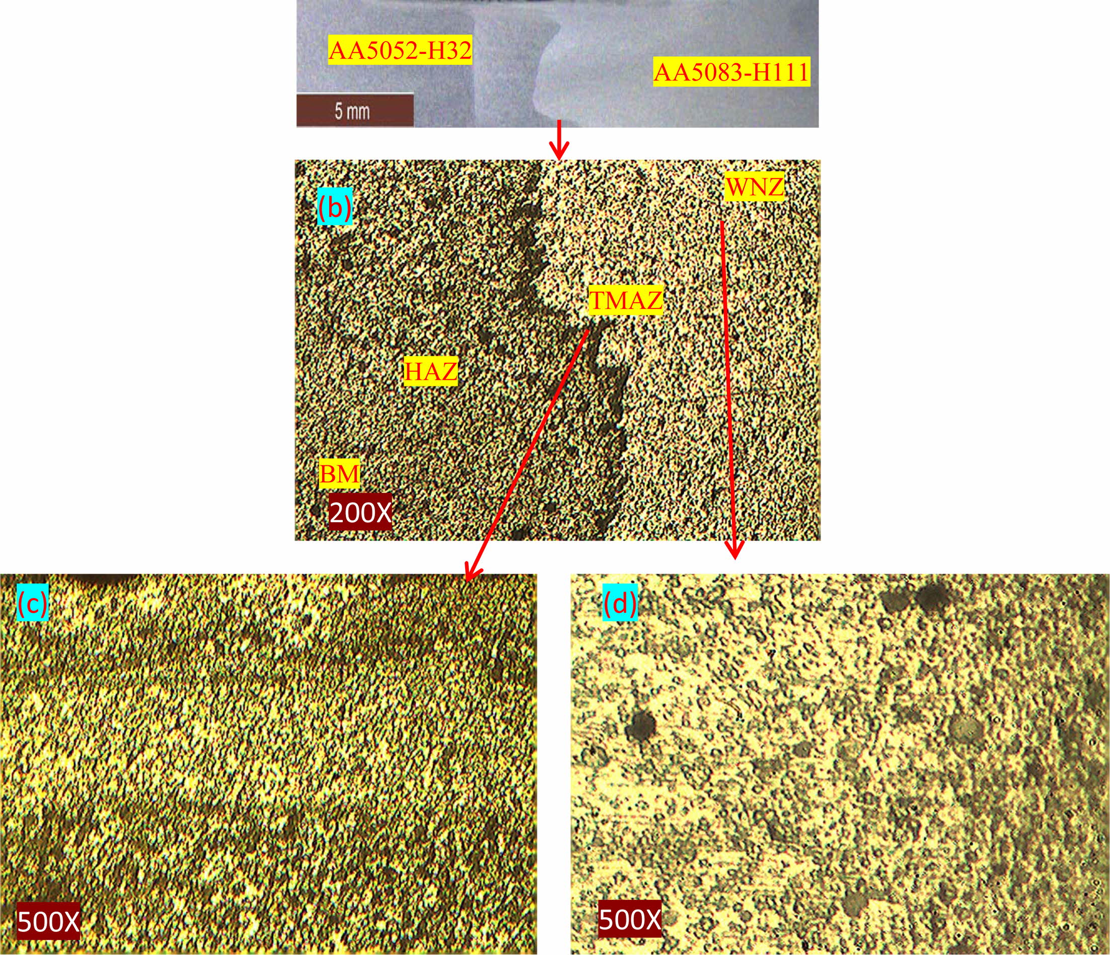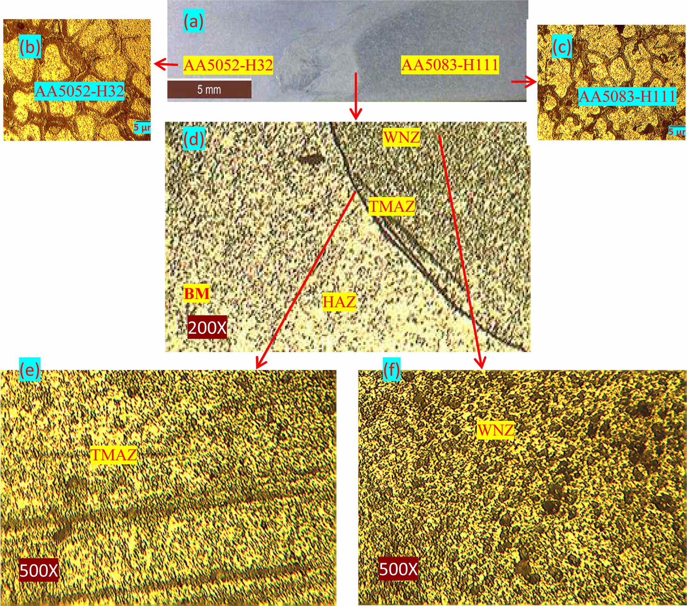 Magnified micrograph showing thermo mechanically affected zone; (f) Micrograph of weld nugget zone. |