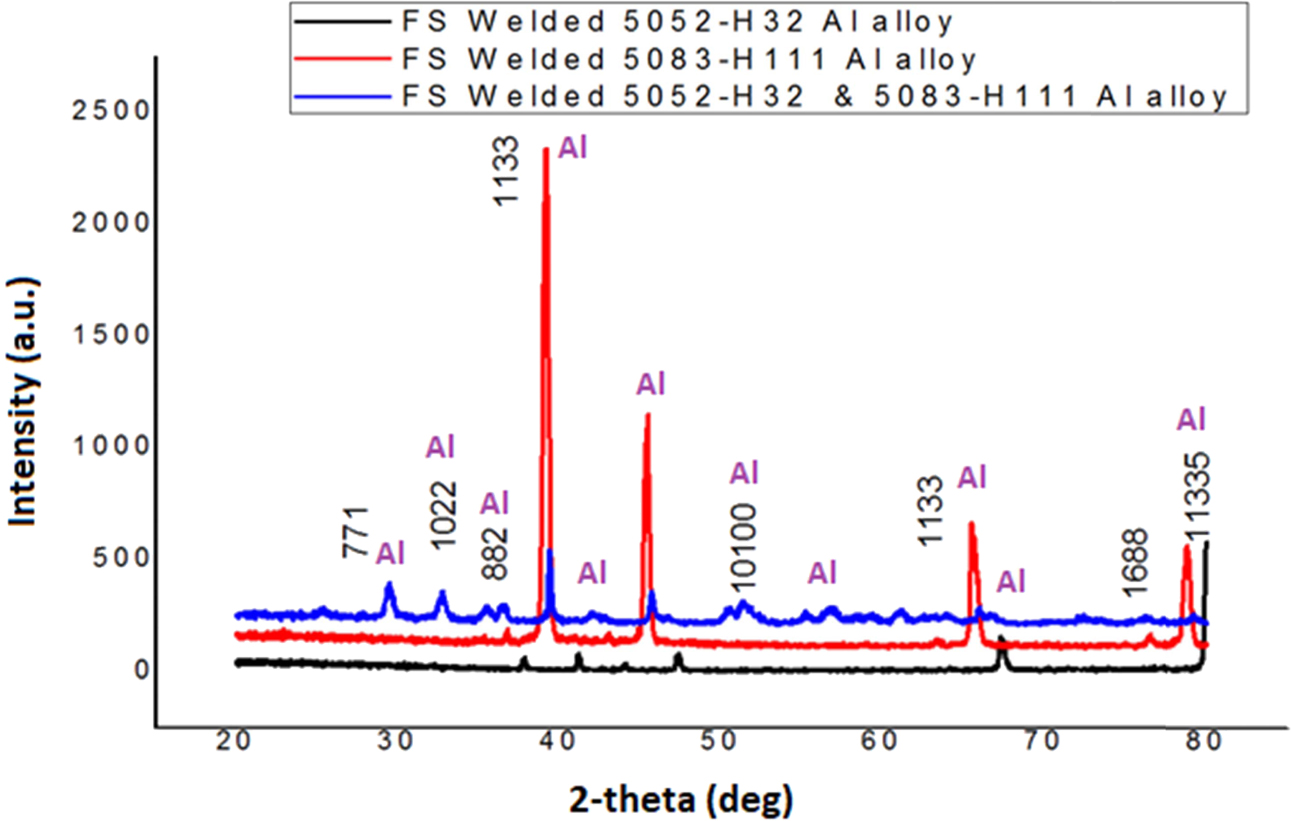 Furthermore, FSW contributes to strengthening of the precipitation as evidenced by the XRD analysis results in Fig. 5, where the intensity of AA5083-H111 alloy peaks, which is then seen to be evenly distributed for the FS welded dissimilar alloy. This is due to the fact that in the WZ due to the effect of FSW, the grain size decreases and becomes finer in the stir zone leading to equiaxial grain distribution.