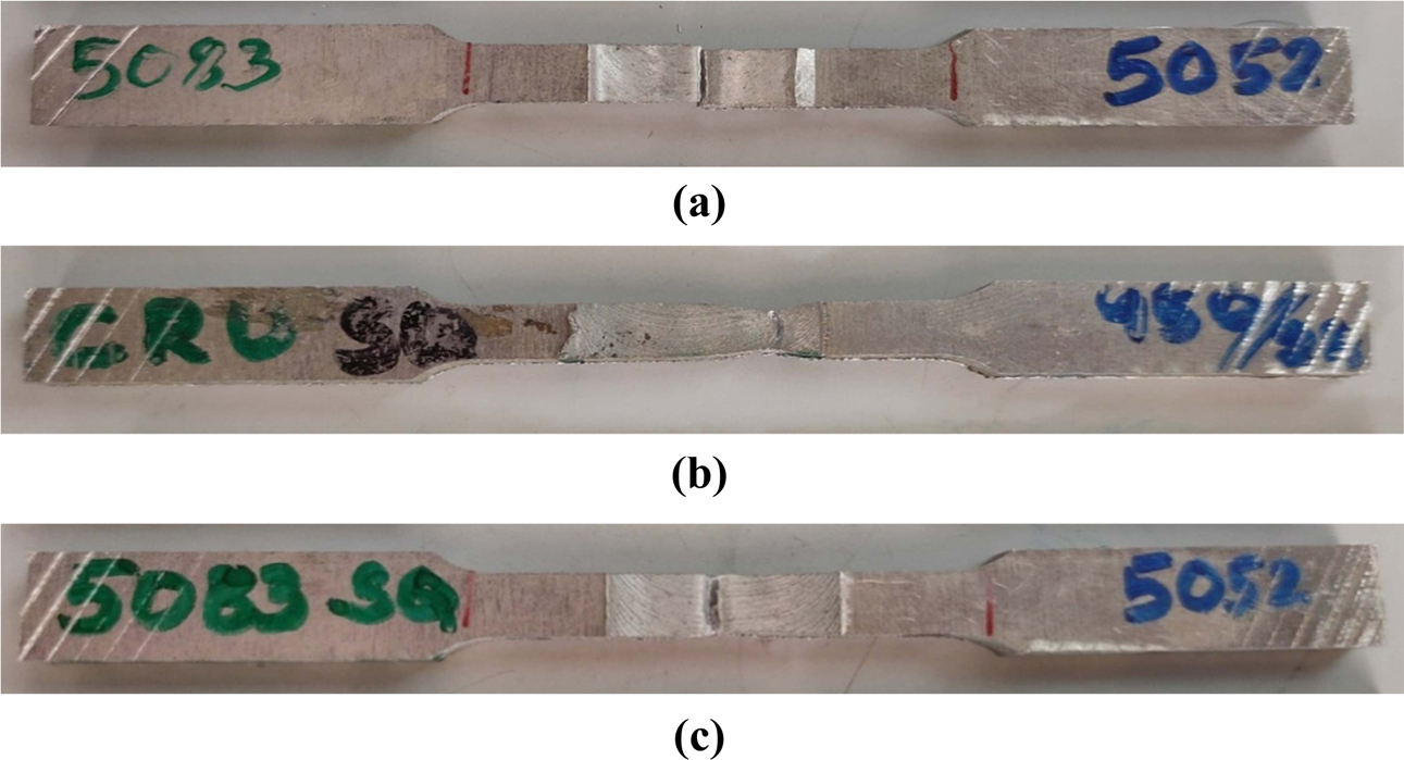 Table 3 enumerates the tensile strength (MPa) of base aluminium alloy AA5083-H111 and AA5052-H32. The AA5083-H111and AA5052-H32Aluminium alloy butt welds for different rotational speed: 800, 1000 and 1200 rpm and 28 mm/min are identified. Fig. 6 illustrates the fracture of the tensile test samples of the FSW joints at various tool rotation speed process parameters.