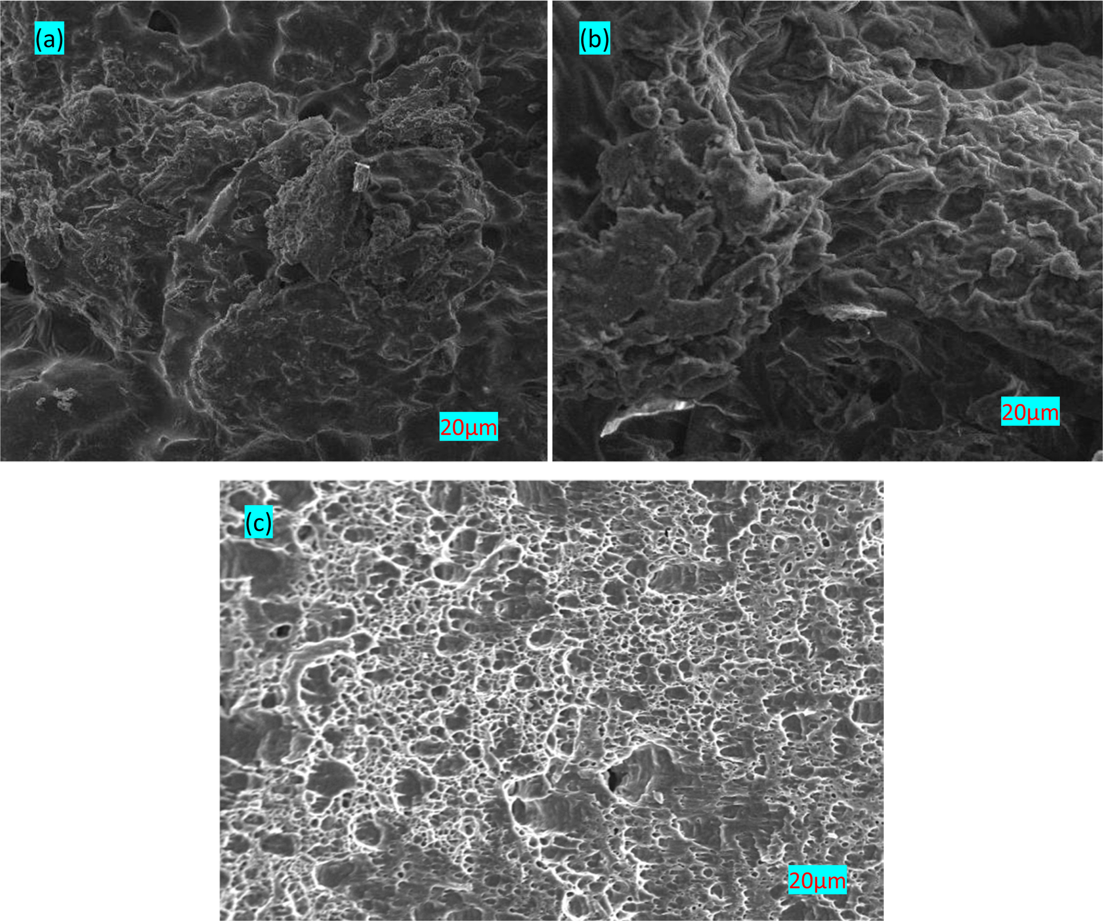 Fig. 7(a-c) illustrates the fracture surface of the UTS specimen of 1000 rpm & 28 mm/min. The extensive plastic deformation has occurred in tensile test even with fracture surface examined at 800 rpm (Fig. 7(a)). It can be seen that the effect of FSW has made the fine grain distribution possible in the weld zone of the specimen thereby leading to finer grain structure formation and distribution (Fig. 7(b)). Similarly, it also shows the dimple characterizing particularly dimple patterns with different size. Due to the elongation, there exists cavities shiny boundary as well. The fracture morphology of the FSW specimen under 1200 rpm process parameter condition can be observed in Fig. 7 (c) where the formation of dimples likely due to the influence of high TRS of 1200 rpm which leads to the failure of the FS welded dissimilar joints.
