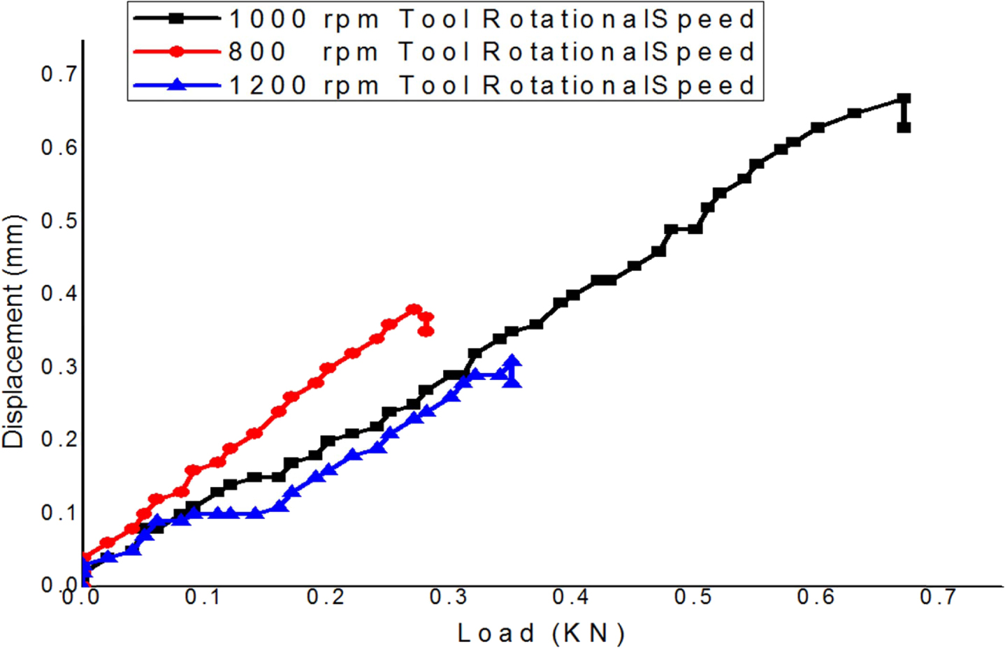 Fig. 8 illustrates the Load vs. Displacement relation- ship observed during the experimental procedures of the FSW dissimilar Aluminium alloys. At 1000 rpm tool rotation speed, the tensile properties are increased due to the reduction in agglomerations compared to 800 rpm and 1200 rpm tool rotation speeds. Fig. 9 shows the microhardness analyses of FS welded dissimilar aluminium alloy AA5083-H11 and AA5052-H32. It is observed that AA5083-H111 alloy kept in the advancing side has 85HV1 of microhardness values of the base metal.