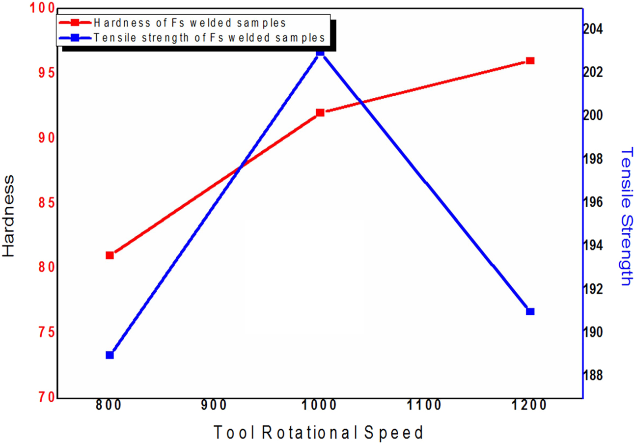 • The experimental weld specimens were characterised for mechanical performance by tensile test and Vickers microhardness survey. The weld specimen exhibited peak tensile strength of 188.52 MPa was joined with the input tool rotational speed of 1000 rpm. The micro- hardness value observed for this specimen was 90 HV which was higher than the one observed under 800 rpm tool rotational speed condition but lower than 1200 rpm condition.