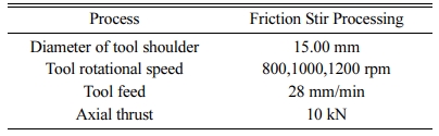 The process parameters for the FSW process were studied from the literature survey. The parameters such as welding speed, tool rotational speed, tool geometry, tool diameter, axial thrust were some of the principal factors that have been identified as major factors of a FSW process [1, 11]. These factors were the focus point of research in studies that analyzed their influence in the welding process and the resultant weld joint charac- teristics [2]. Among these parameters, tool rotational speed, tool feed and axial thrust particularly influence the grain structure of the weld joint of light density alloys such as aluminium and magnesium alloys [6]. Thus the present study involved the analysis of behavior weld joint with four input parameters such as square tool shoulder diameter, tool rotational speed, tool feed and axial thrust. Among these parameters, the tool rotational speed was varied in the present study to analyze its effects on the resulting weld joint.