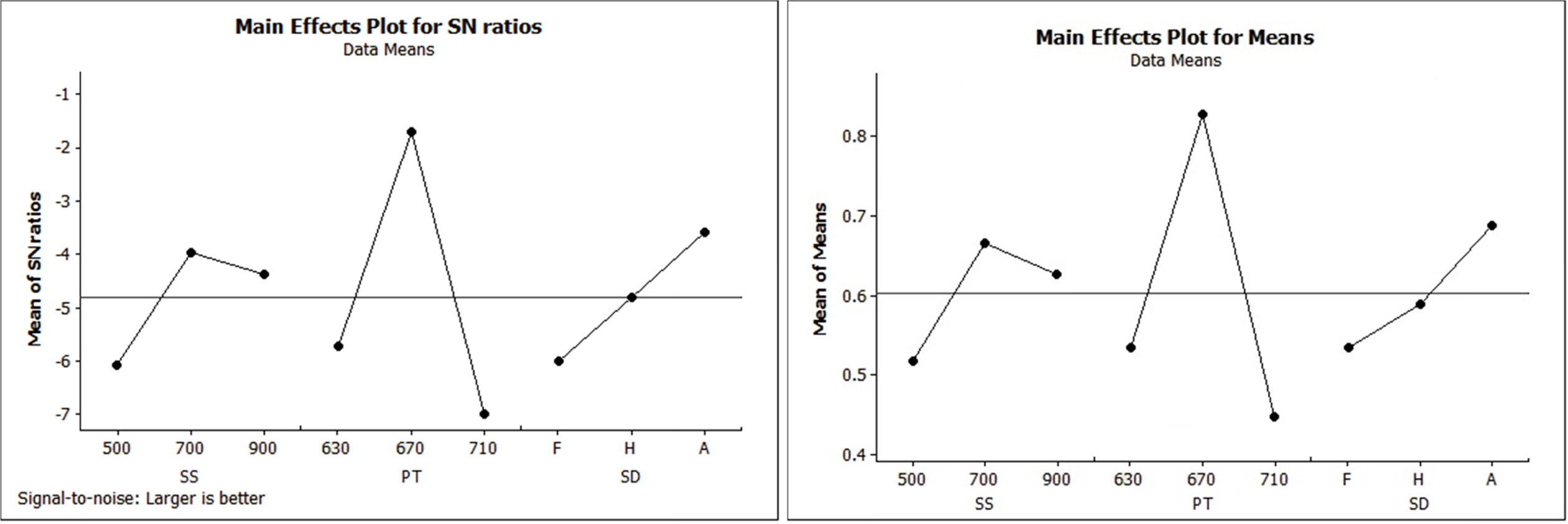 Fig. 2 Main effect plots for S/N ratios and means. |