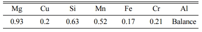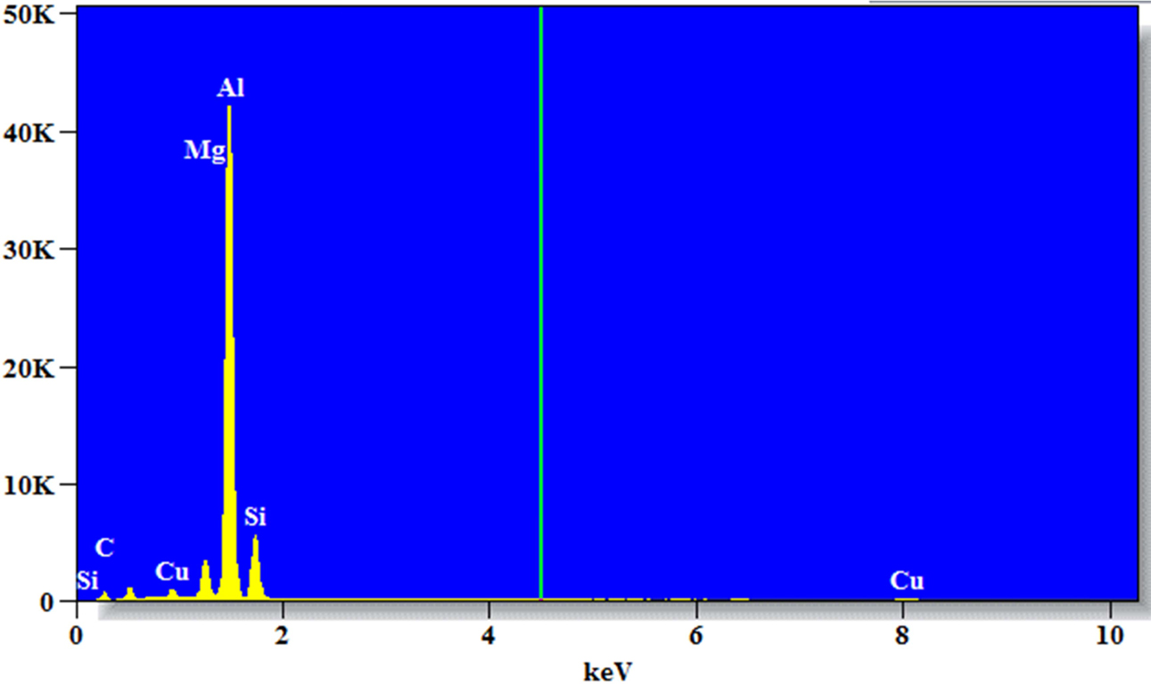 Fig. 3 illustrates the SEM and EDX mapping images of the composite prepared for confirmation test. From the SEM-EDX mapping analysis, it was seen that the SiC particles are located in the matrix, and confirms the existence of SiC particles addition in the composite [20]. As given in Fig. 3 SiC particles (green region) can be observed in the matrix. Also Si region was clearly visible; Al matrix region (cyan colour) was visible overall except the SiC particle region. Mg (blue region) was evenly distributed in the matrix as it provides solid solution strengthening effect. The Mg was also visible in the SiC particle region, which is because Mg addition helps to increase the wettablility between particle and matrix. Fig. 4 shows the SEM EDX area scan data of composite which shows the Al, Mg, Si, Cu, Si and C peaks.