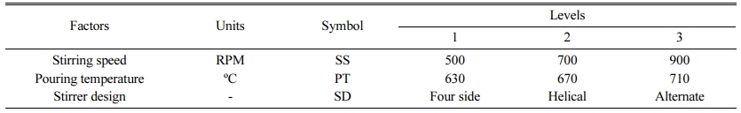 In an attempt to analyze the mechanical performance of the composite, three process parameters, such as, the stirring speed (SS, RPM), pouring temperature (PT, ºC) and stirrer blade design (SD), each at three levels, were chosen based on past researchers work [3, 4, 19]as shown in Table 2. Fig. 1 shows the three different designs of stirrer blades used for mixing the molten matrix. Four side peddle stirrer has impeller blades on single plane, alternate peddle stirrer has blades on dissimilar plane and helical stirrer has ribbon shape blade.