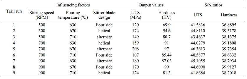 The GRG data is modified into S/N ratios using Minitab analytical software. The influencing parameters were determined from the delta rank in the response table for S/N ratios as seen in Table 6. The delta ranks were calculated from deriving the variation among the largest and the smallest average value of each parameter. Allocation of ranks was corresponding to the delta range. The largest delta range was selected for the first rank and indicates the prime factor influencing the mechanical properties. Table 6 shows that the pouring temperatures with delta range of 5.258 will be the highest contributing parameter. The next highest influencing parameter is the stirrer blade design with delta range of 2.402 and finally the stirring speed with delta range of 2.106.