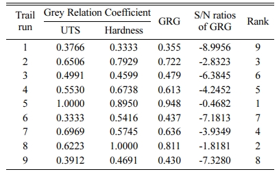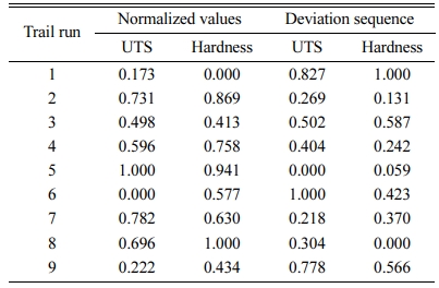 GRA is generally selected to determine a solution to problems involving a limited set of results. It is com- monly used to get the estimated results of unknown structure. GRA has been broadly utilized to optimize issues consisting of several factors and outputs [9]. Initially input data conversion by GRG was executed on the results of the experiments in Table 3, such as, UTS and Hardness. The normalized values of the outputs in the range of 0 to 1 were achieved by normalization of values utilizing the Equation 6 from reference [9]. Then, the deviation sequence was cal- culated utilizing Equation 7 from reference [9]. Table 4 shows the normalized values and deviation sequence found from data conversion.
