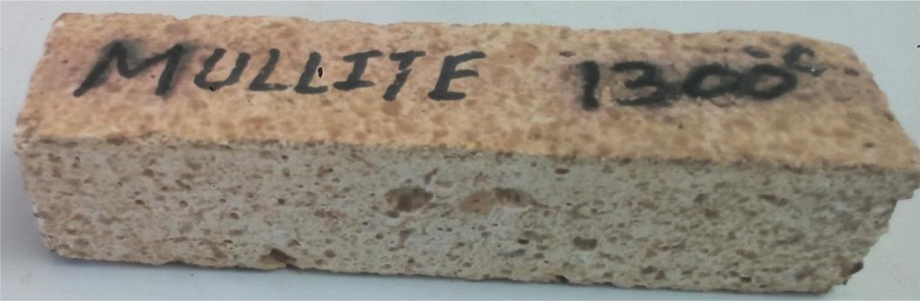 The castables were prepared by using the wet process method. The raw materials were dried and mixed with different percentages of mullite gel (say 1 mL of gel in 100 g of batch) [21]. In order to obtain the desired flow and consistency of the mixer solution, the required amount of water was added. The mixed composition was cast in steel molds of the following dimensions: 50 mm cube and 120 mm x 40 mm x 40 mm rectangular bar shapes. It was allowed for 24 h curing in the mold. The cast shapes were demolded and cured in air for 24 h and then oven-dried at 110 oC. Fig. 3 shows the developed mullite bonded castables. After drying, it was heat-treated at 1100 oC and 1300 oC for property evaluation.