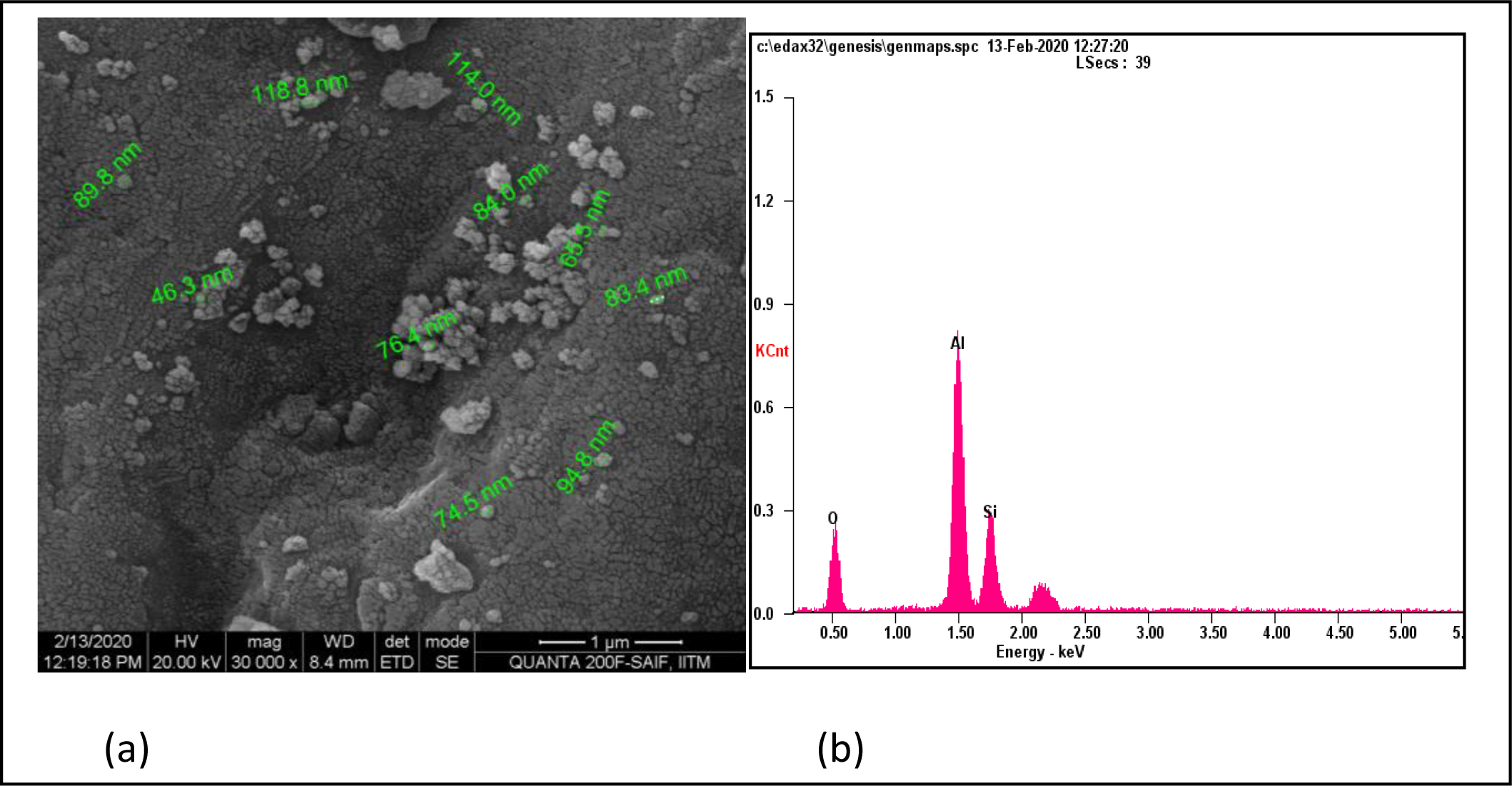The microstructure of mullite powders calcined at 1400 oC is shown in Fig. 7. The SEM micrograph in Fig. 7(a) shows small distributed and little agglomerated spherical particles in the size range between 46.3 nm and 65.5 nm with the maximum value of spherical particles being around 118.8 nm. EDX analysis as shown in Fig. 7(b) confirms the presence of aluminum, silica, and oxygen.