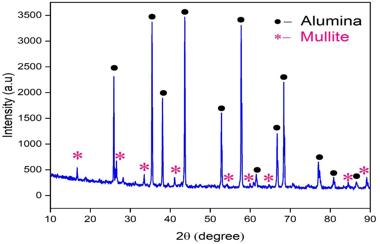 Fig. 8 shows the XRD pattern of the castables. It shows the presence of sharp crystalline peaks of alumina and mullite. The present XRD peaks were well matched with the JCPDS no. 06-0258 and also matched with the recent work done on mullite bonded castables [9]. No other impurity phases and unreacted phases were present in the sample.