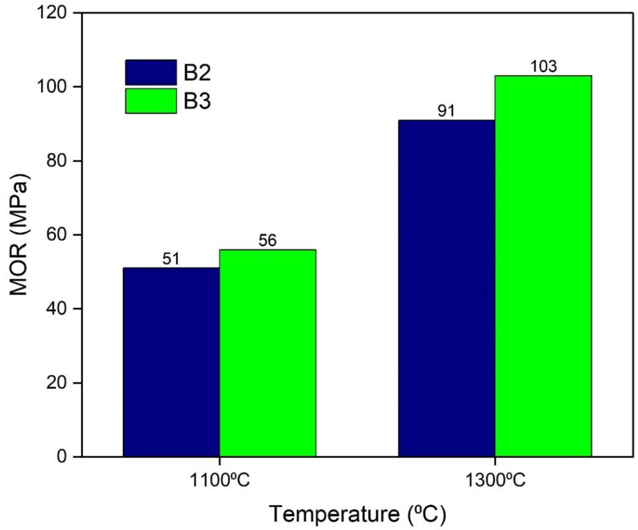 The Cold Crushing Strength (CCS) values of the different castable compositions at different processing temperatures are shown in Fig. 10. It shows lower strengths under dried conditions due to the formation of mullite gel bonded castables; however, this increases the strength of the castables. The batch with 7% mullite gel resulted in higher CCS values compared to the batches containing 5% gel. The batches only measured the temperature levels at 1100 oC and 1300 oC. The formation of mullite leads to greater density and hence higher CCS values.
