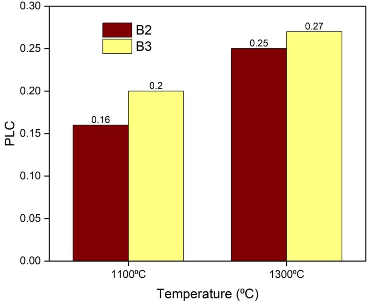 The PLC of the castables is reported in Fig. 12. It was found to decrease the measured values. The PLC values after calcining at 1100 oC and 1300 oC are slightly in- creased. The increase in PLC is caused due to the volu- metric expansion of mullite in the castables. An increase in temperature resulted in an increase in the PLC value.