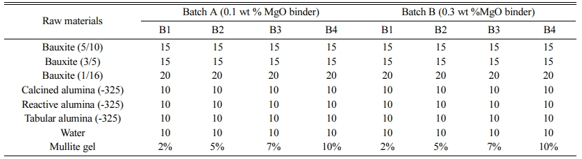 The starting raw materials of the castables are different grades of bauxite, calcined alumina, reactive alumina, and tabular alumina with 0.1% and 0.3% of MgO as additives [12, 19, 20]. Table 1 shows the batch composition of the prepared raw materials.