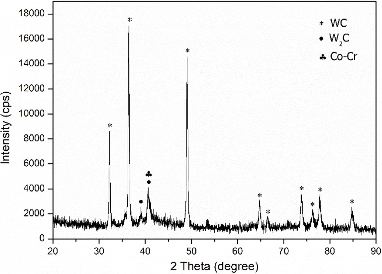 The XRD pattern of the HVOF-sprayed WC-10Co-4Cr coating is presented in Fig. 1. Most diffraction peaks belonging to WC are detected, indicating that the coating is mainly composed of WC phase. Some weak peaks corresponding to W2C and Co-Cr are also confirmed in the XRD result. The content of W2C and Co-Cr phase are relatively low, showing that HVOF method can effectively inhibit the generation of decarbonization phase, mainly due to the high flow nitrogen injected into the flame stream to increase the combustion chamber pressure. Compared to the traditional combustion chamber pressure (0.6-0.9 MPa), the combustion chamber pressure in our work exceeds 2.2 MPa, which provides higher flight speed for powder particles.
