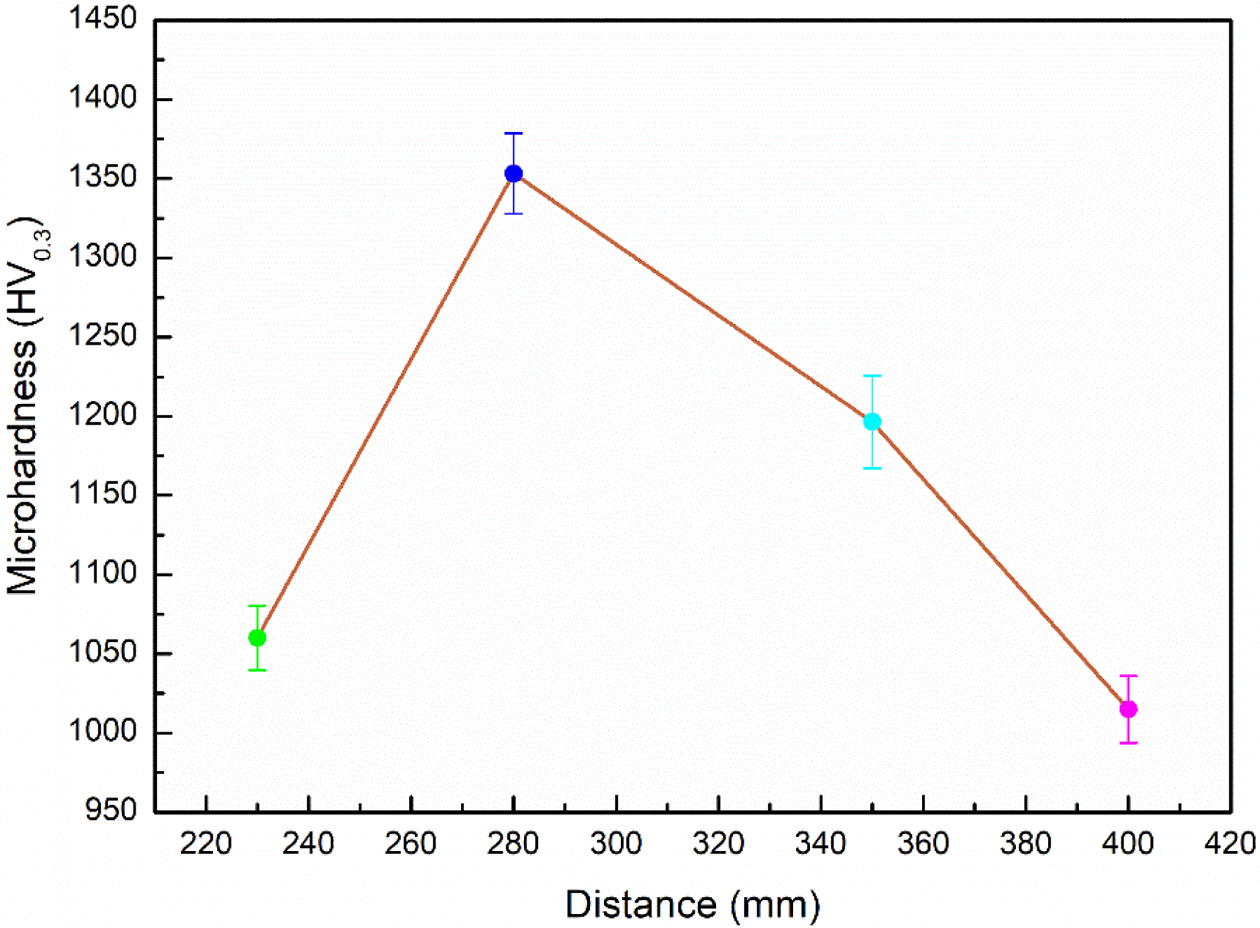 Fig. 3 presents the micro-hardness as a function of spraying distance ranging from 230 mm to 400 mm. A highest hardness of 1353.3 HV0.3 is achieved for spraying distance at 280 mm, which corresponds to a 43% increase, as compared with uncoated M42 steel. When the spraying distance exceeds 280 mm, the micro-hardness of WC-10Co-4Cr coating exhibits a sharp deterioration. When the spraying distance is smaller than 280 mm, the power particles are easy to rebound away the M42 substrate, resulting in an increase of porosity, which can greatly affect the hardness of the coating. With the increase of spraying distance, the micro-hardness didn't present a consistent tendency. The main reason is that the large spraying distance maybe decrease the kinetic energy of powder particles when they reaching the surface of M42 steel, which resulting in a poor densification of the coating.